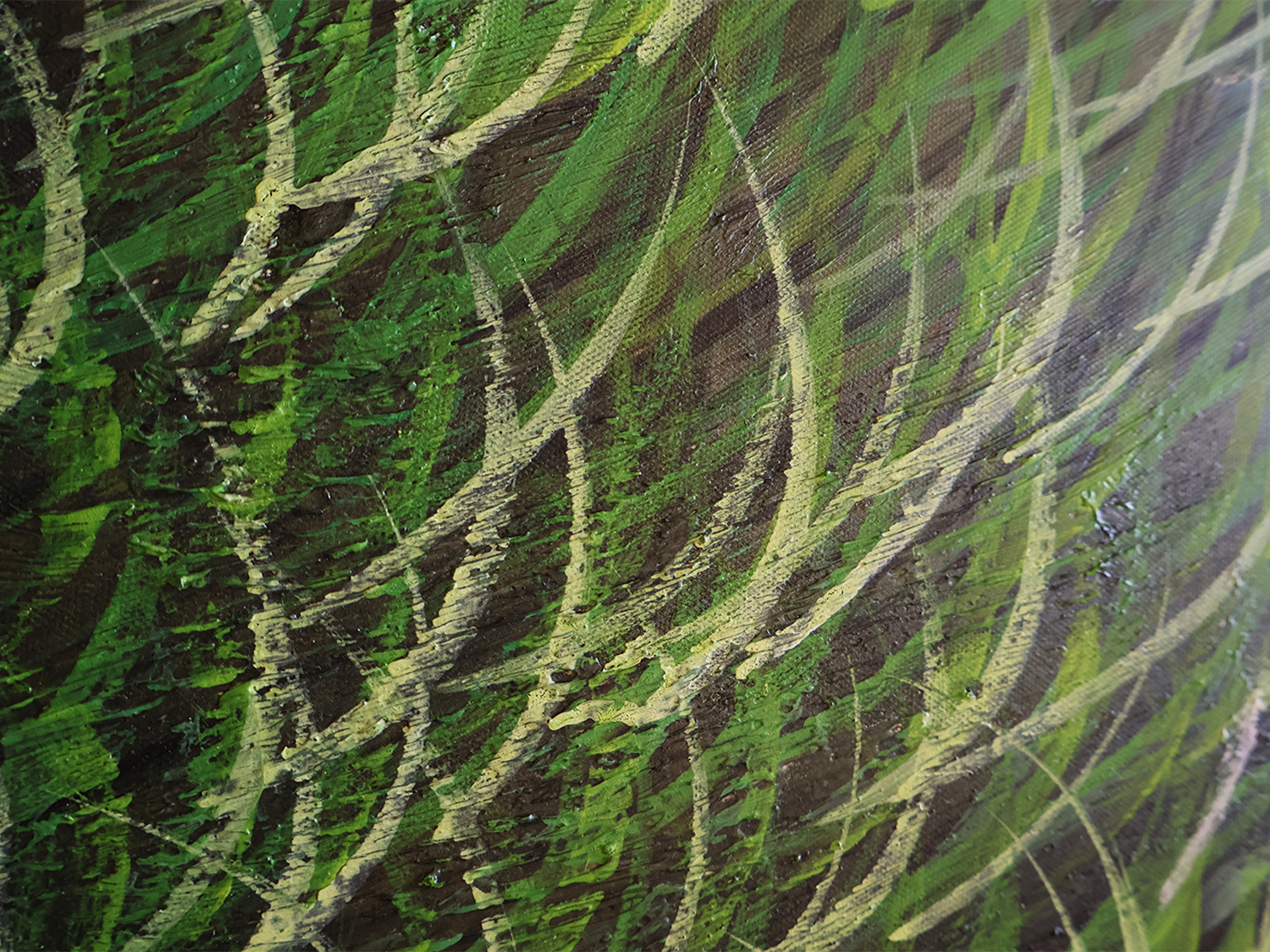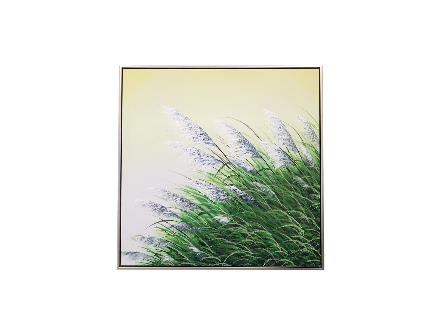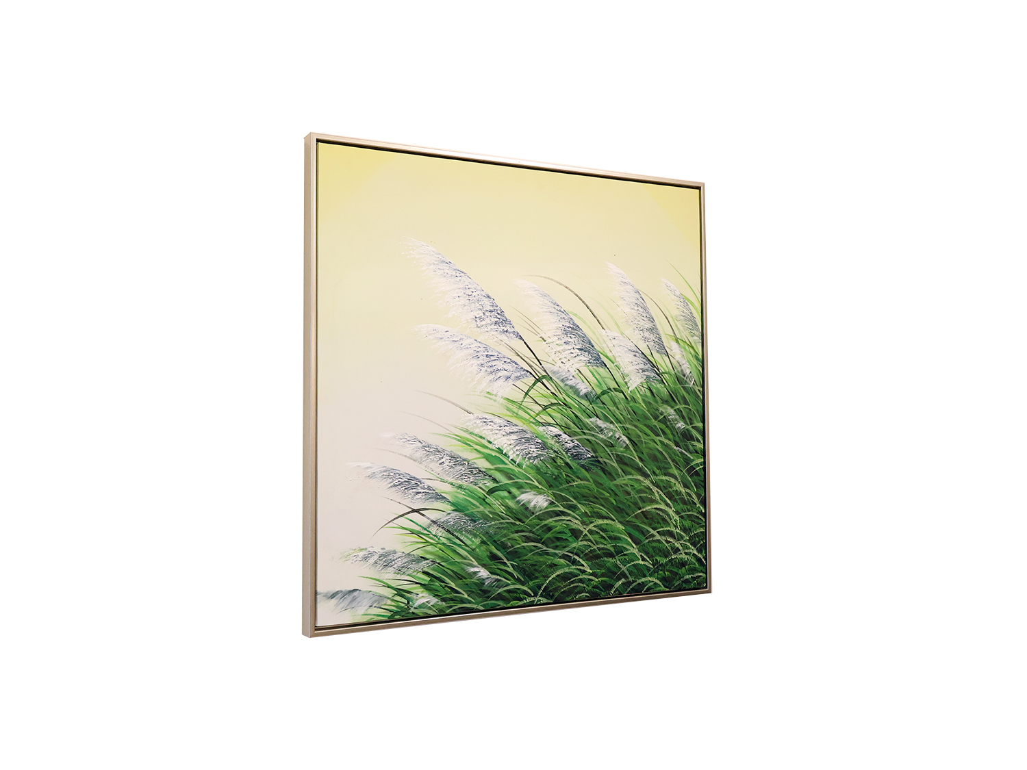 The AZLE Hand artwork features tall, green grass blades with feathery, white plumes at the top, set against a soft , muted yellow background. The style is somewhat impressionistic, focusing on the texture and movement of the grass rather than precise botanical detail. The painting is framed with a thin, metallic border, enhancing its presentation. and you can bring that to your walls with this unique collection of art.
