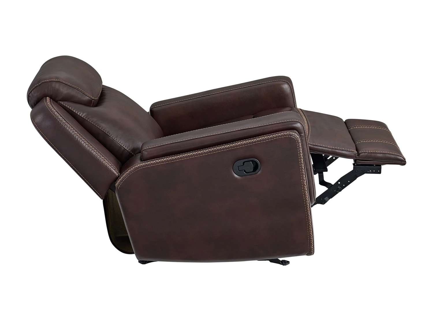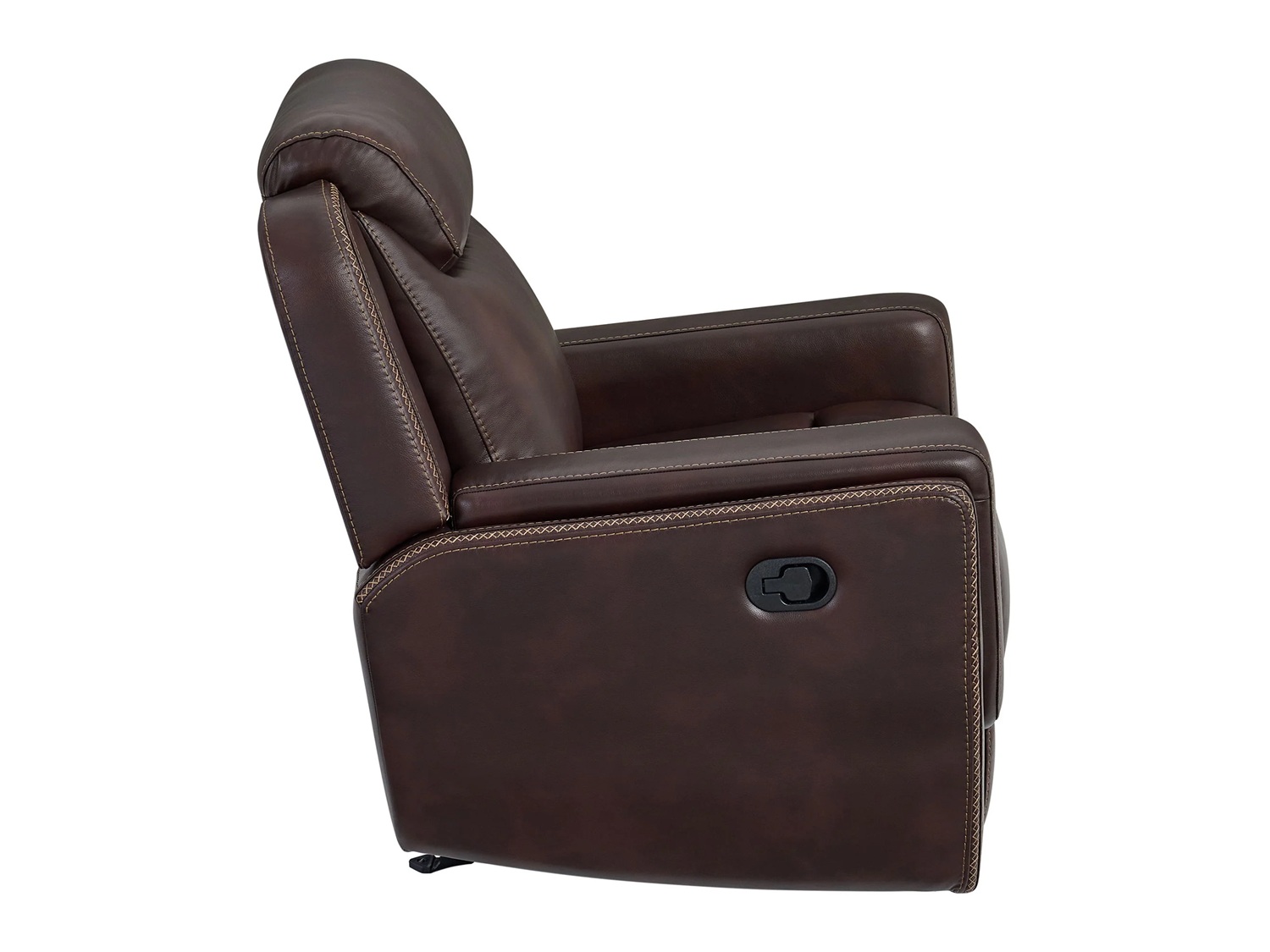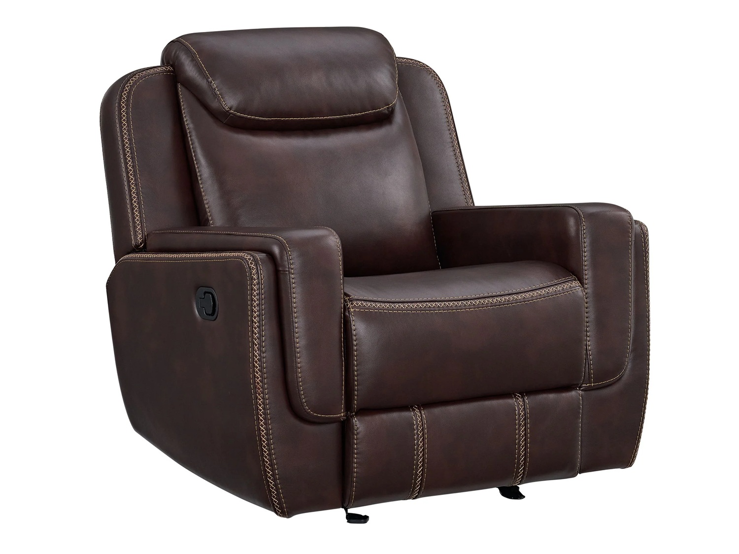 Sink into the luxurious comfort of the BISTRA Glider Recliner Chair. Wrapped in faux leather upholstery that is decorated with contrast stitching, this recliner chair adds a touch of sophistication to your space. Its smooth gliding motion and user friendly recline mechanism offer a haven of tranquility at the pull of a lever. Plush foam cushioning, spacious seating, and padded armrests create comforting bliss, perfect for extended periods of repose. Built with a sturdy frame and durable upholstery, the BISTRA Glider Recliner Chair blends timeless design with lasting quality, creating the ultimate retreat in your space.