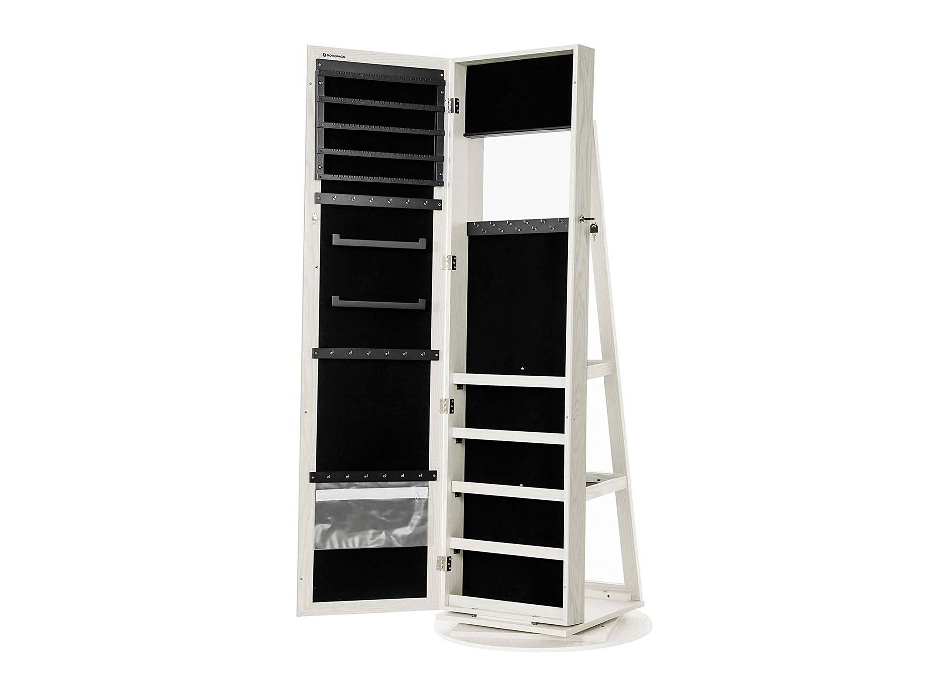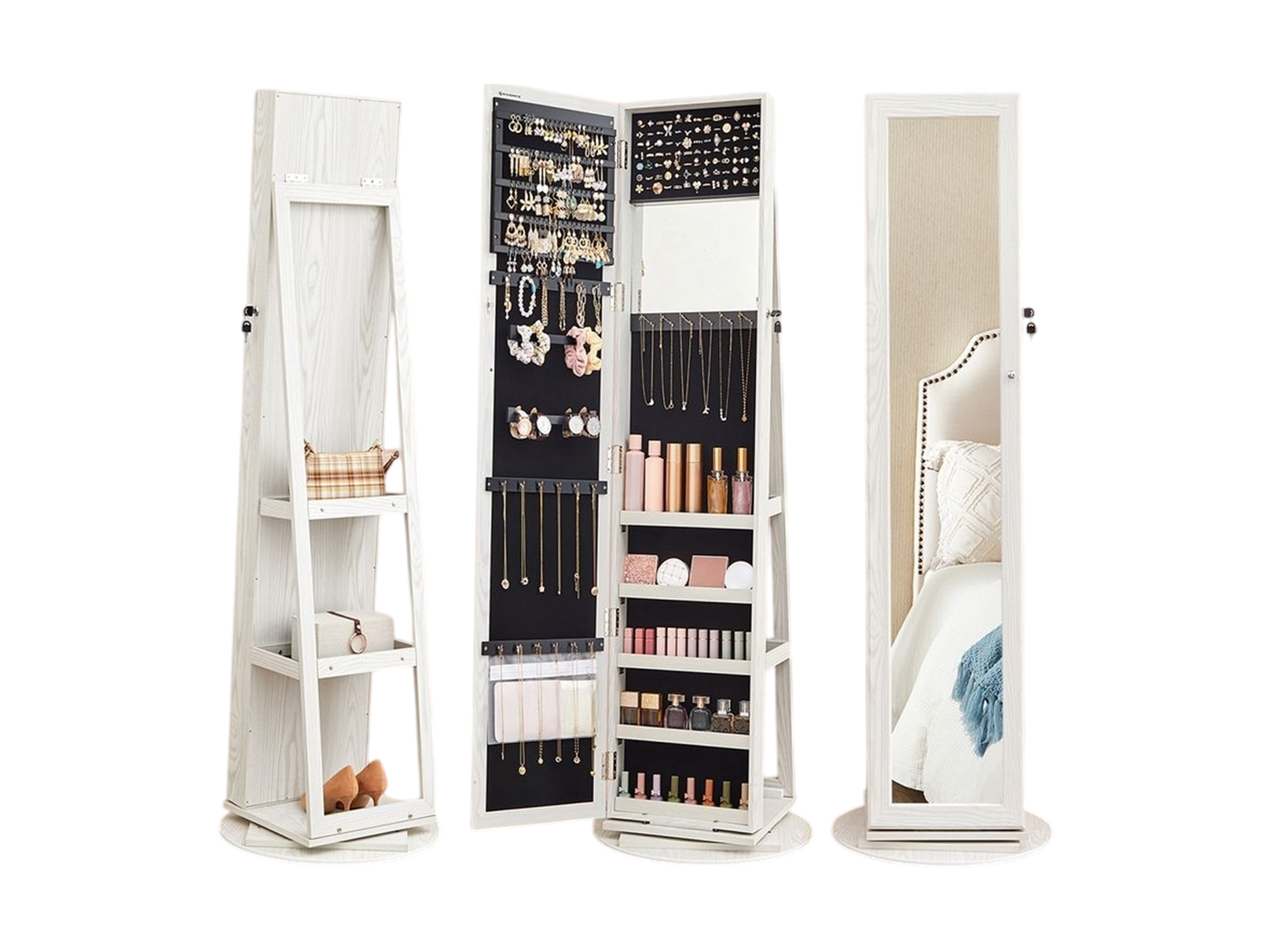 Meet the CELON Jewellery Cabinet, your all-in-one glam station that blends smart storage with modern elegance. This 360° rotating white-framed mirror hides a full jewellery wardrobe inside, perfect for keeping every accessory organized, protected, and easy to find. Open it to reveal a beautifully structured interior featuring 90 earring slots, 48 stud holes, 32 necklace hooks, a bracelet bar, 2 dust-proof pockets, ring slots, and 5 storage racks. And with its lock-and-key security, your treasures stay safe and stylishly stored.