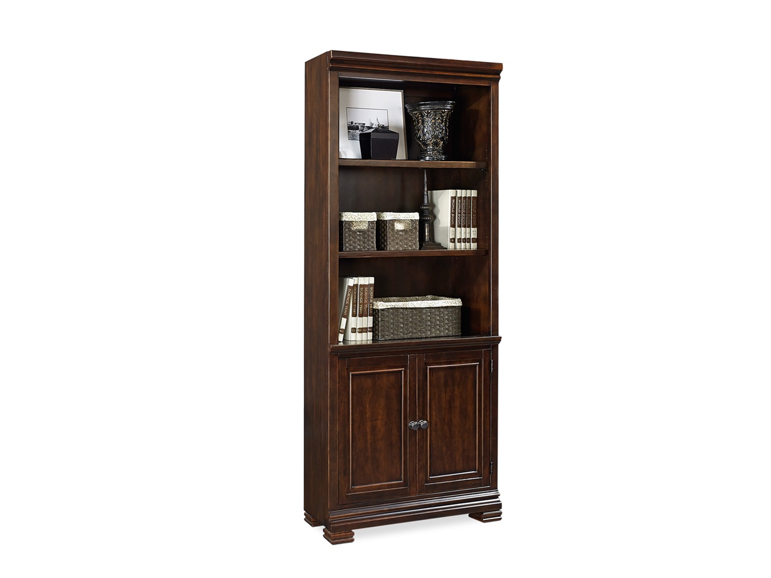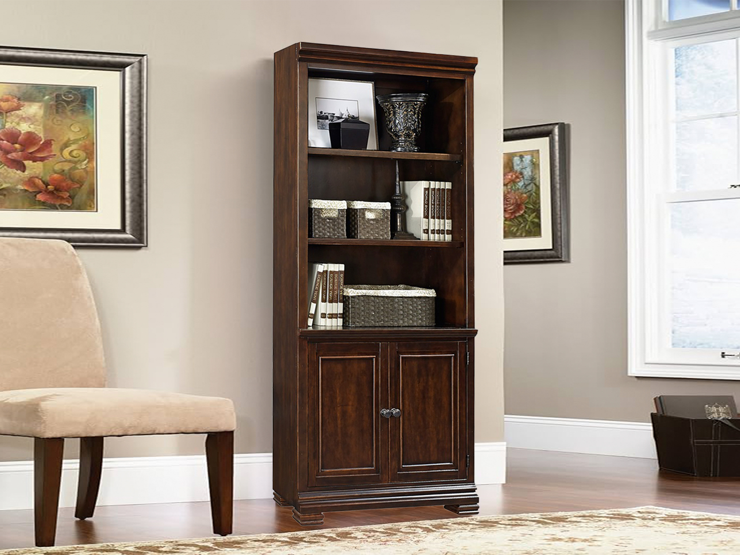 The ELBA Door Bookcase captures the spirit of traditional meets new! Don’t let the traditional style fool you. The neutral brown ale finish combined with today’s style-updated rubbed bronze hardware is fresh but familiar.