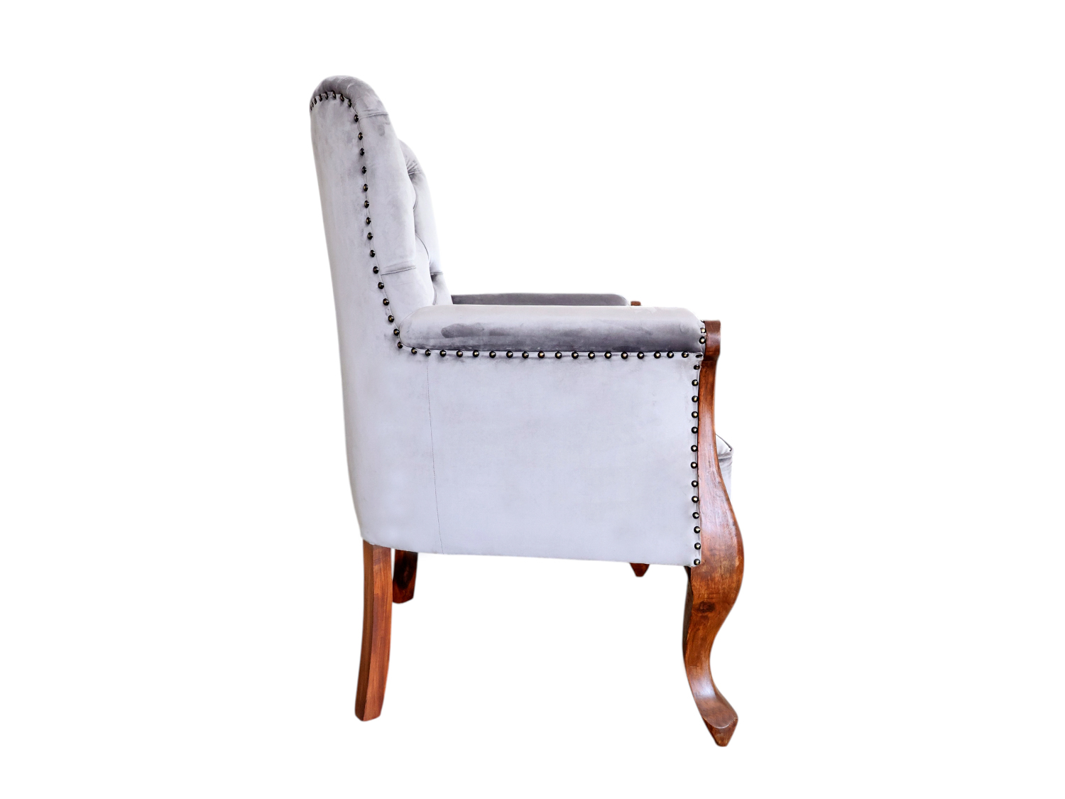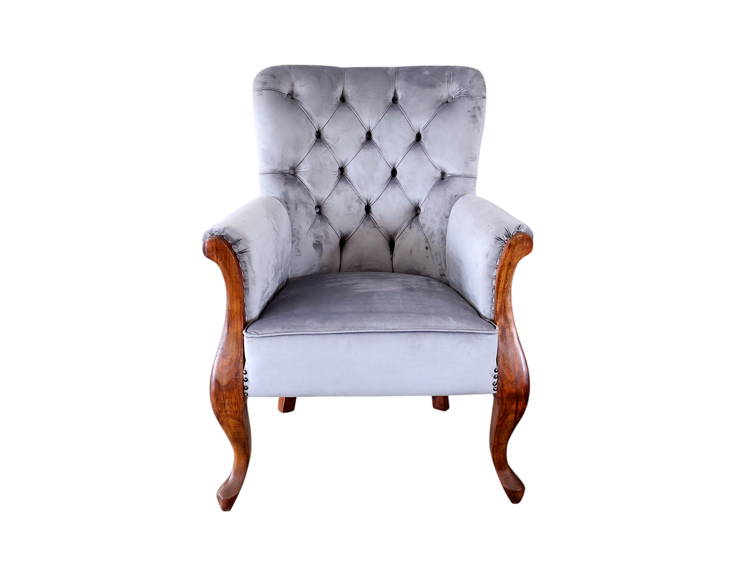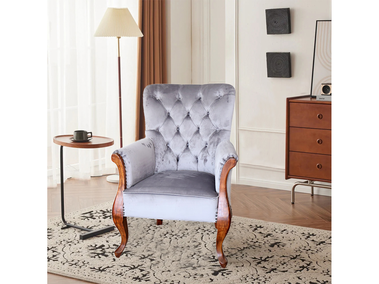 Looking for an stunning Accent chair that is characterized by excellent design and durability, it would be a good decision if you choose this product. The ERITHON Accent Chair opulent Grey velvet fabric not only brings a sophisticated touch but also offers a soft, welcoming texture that enhances the overall aesthetic of any space, while the densely filled seat aims to offer you optimal comfort when sitting. A tufted back, nail head trim and wooden feet finish off this timeless look.