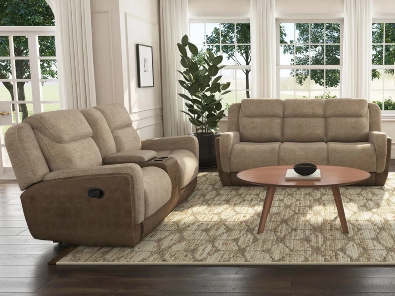 Transform your living space into a haven of comfort and style with the FENES Reclining Sofa & Loveseat with Console. Featuring two-tone fabric upholstery, it delivers a sleek, contemporary look that elevates any room. The manual reclining mechanism lets you find the perfect angle for relaxation, while steel springs and foam cushions ensure long-lasting support. Sink into the plush cushioned seats, backrests, and armrests, designed for all-day comfort. With sturdy, wide armrests offering extra support, you’ll feel completely at ease. Plus, the center console features built-in cup holders and storage, making it the ideal spot for unwinding with all your essentials close at hand.