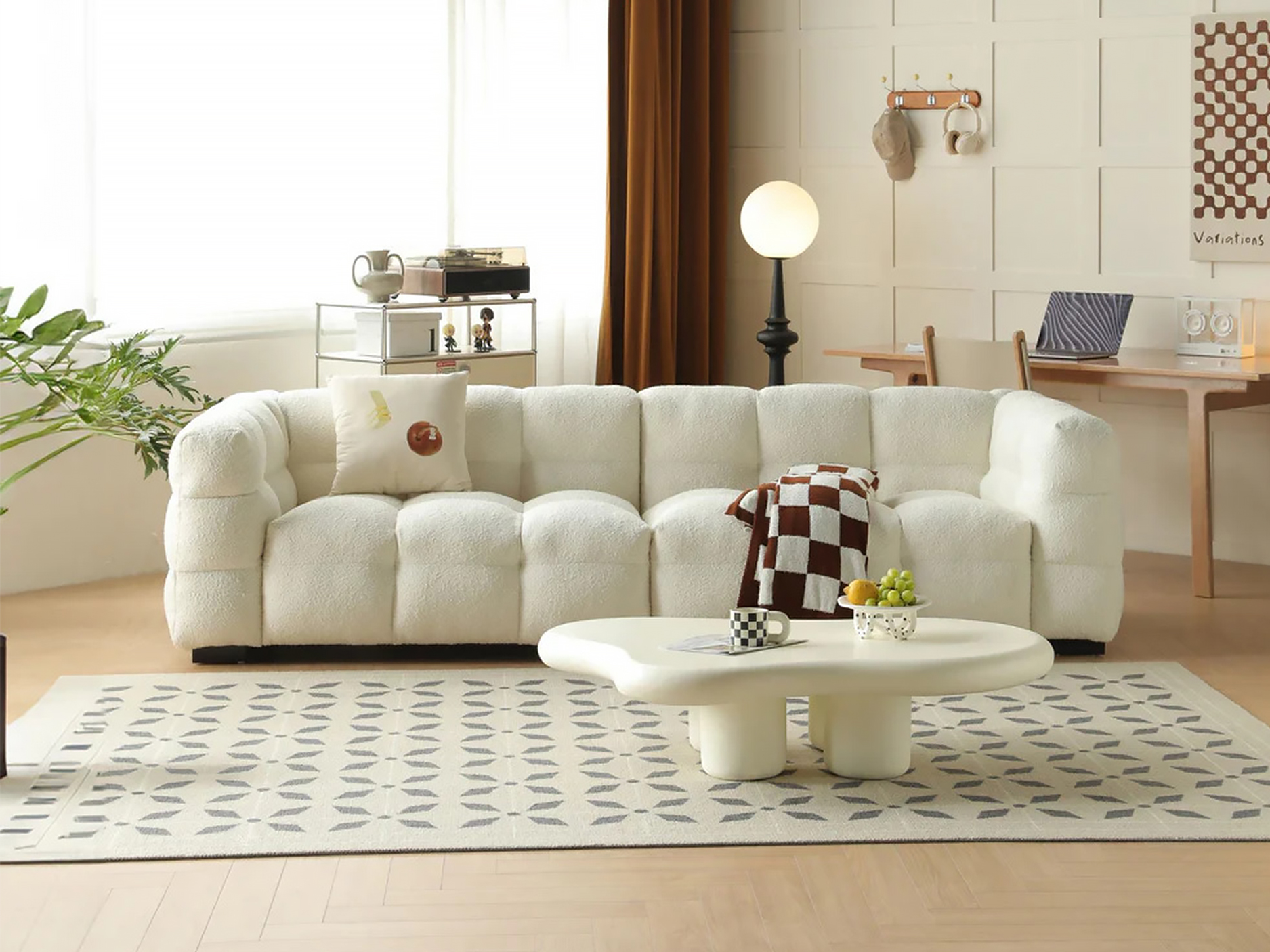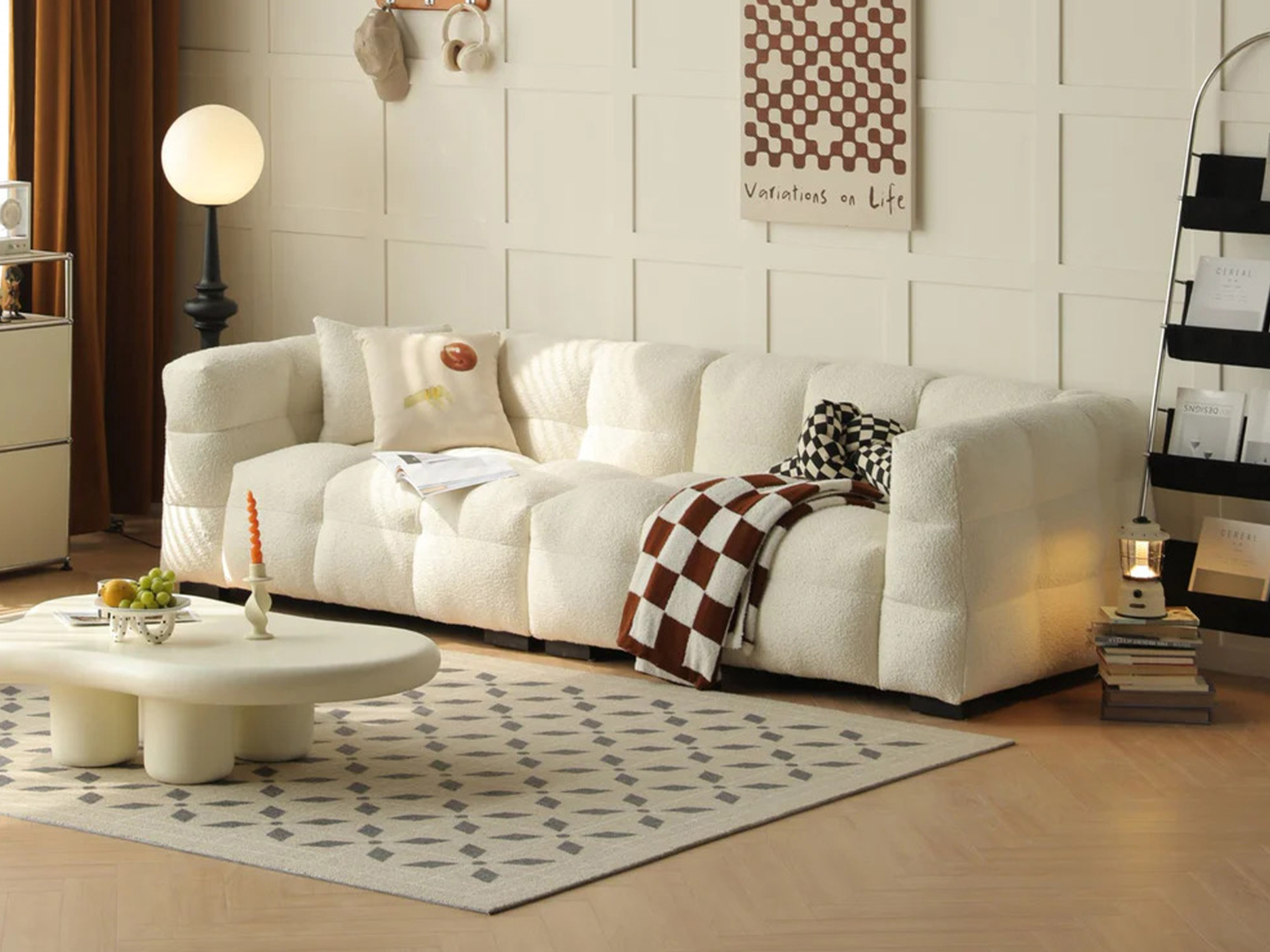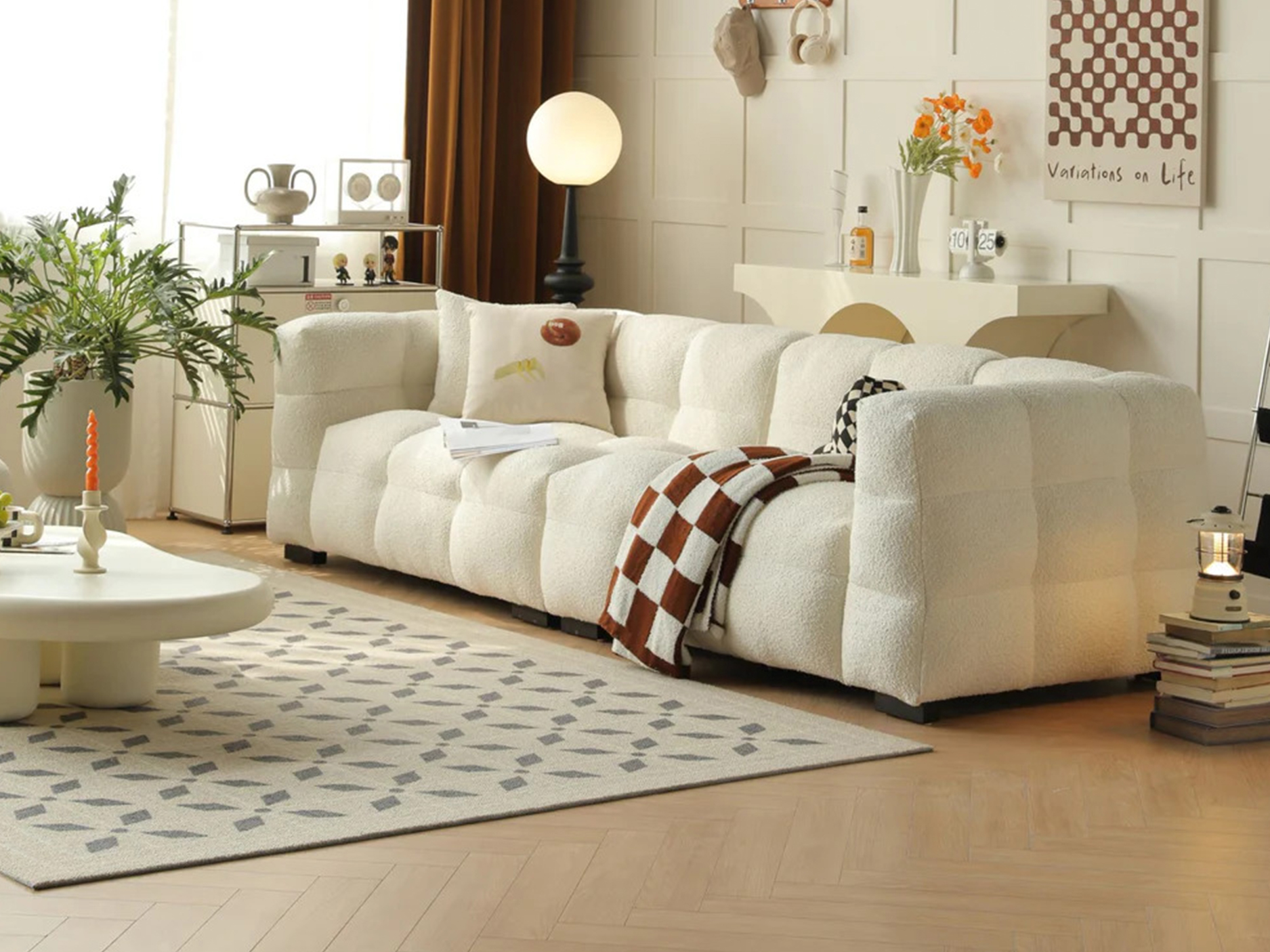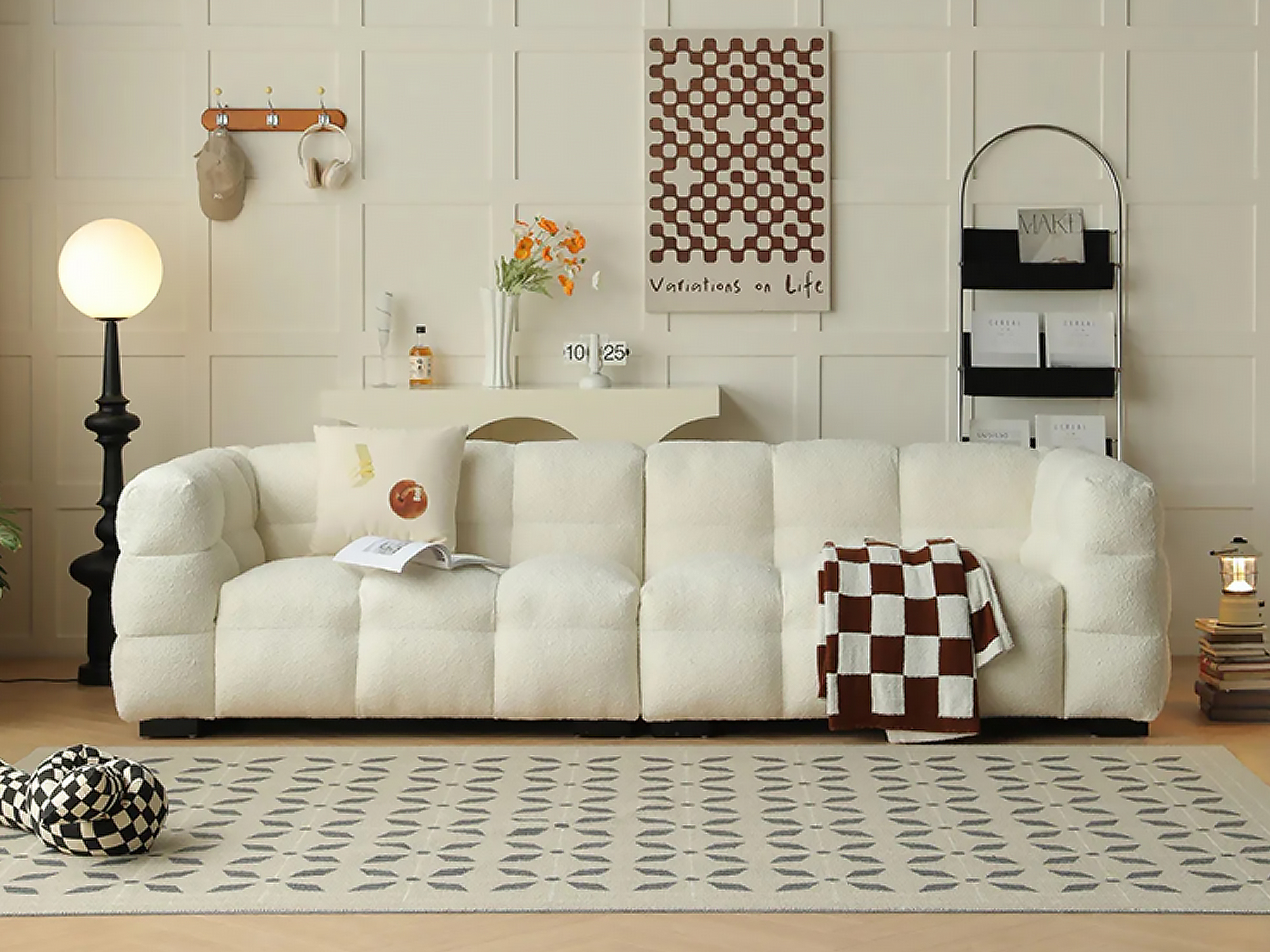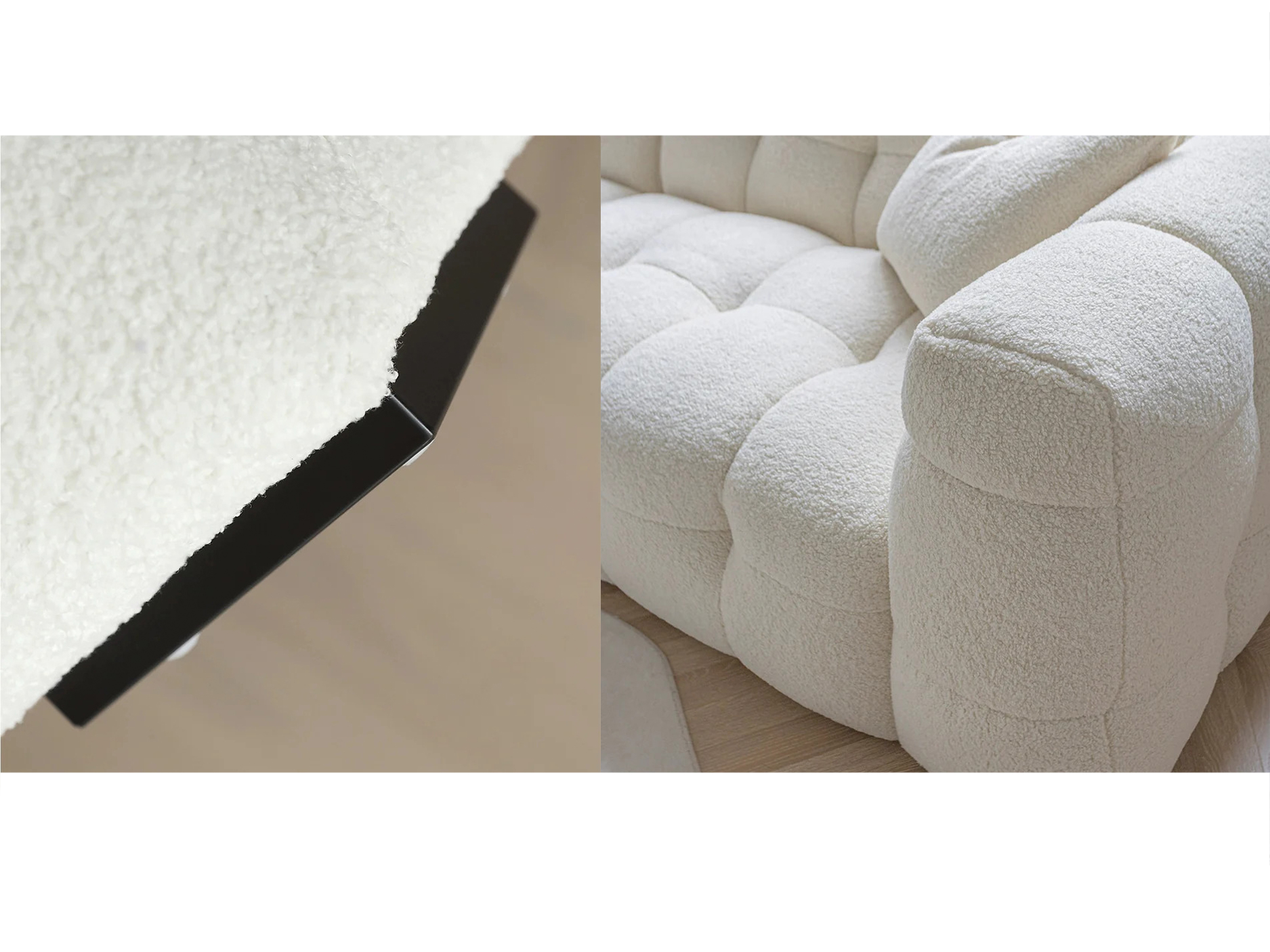 Sink into softness with our LAZIO sofa collection , defined by sculptural curves, cloud-like comfort, and modern craftsmanship. From the cozy 3-seater to the bold 4-seater, each piece pairs plush bouclé texture with a sleek, contemporary silhouette. With hand-stitched detailing, solid wood framing, and supportive high-density foam, these sofas offer warmth, style, and effortless lounge-ready comfort for any space.