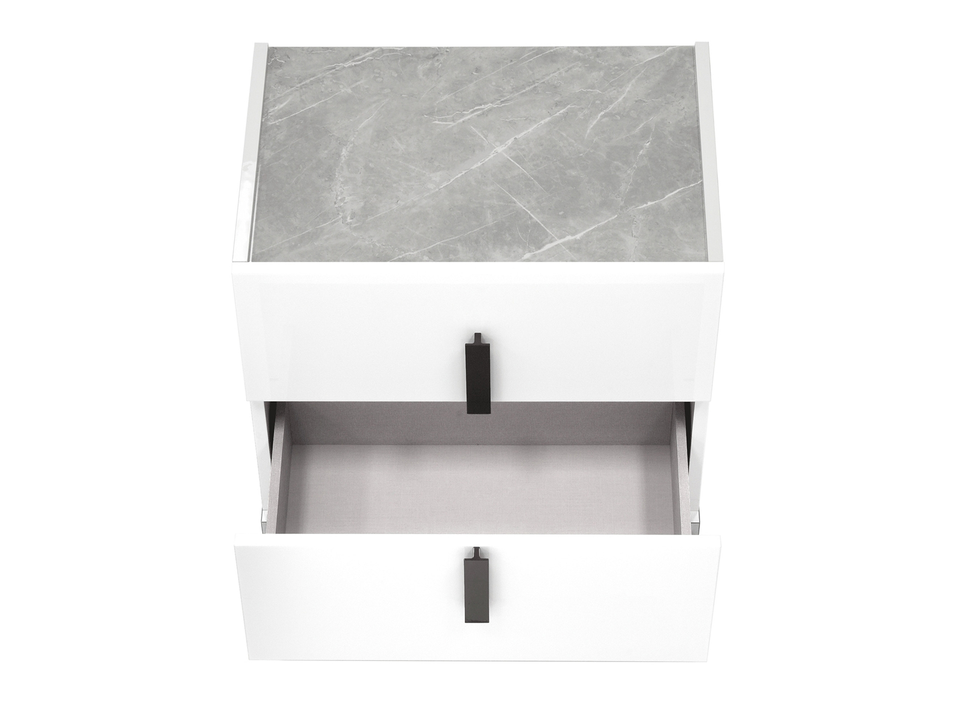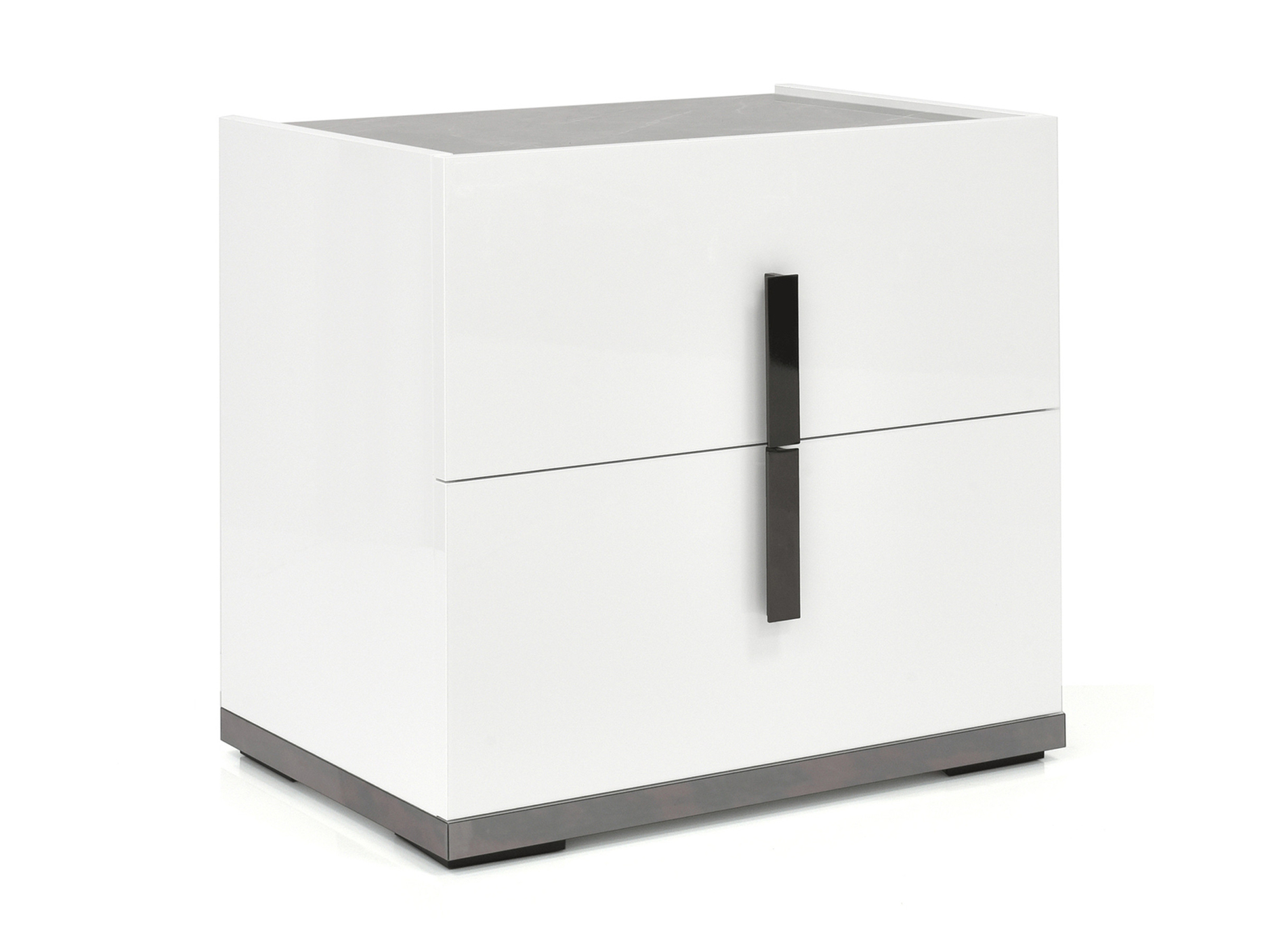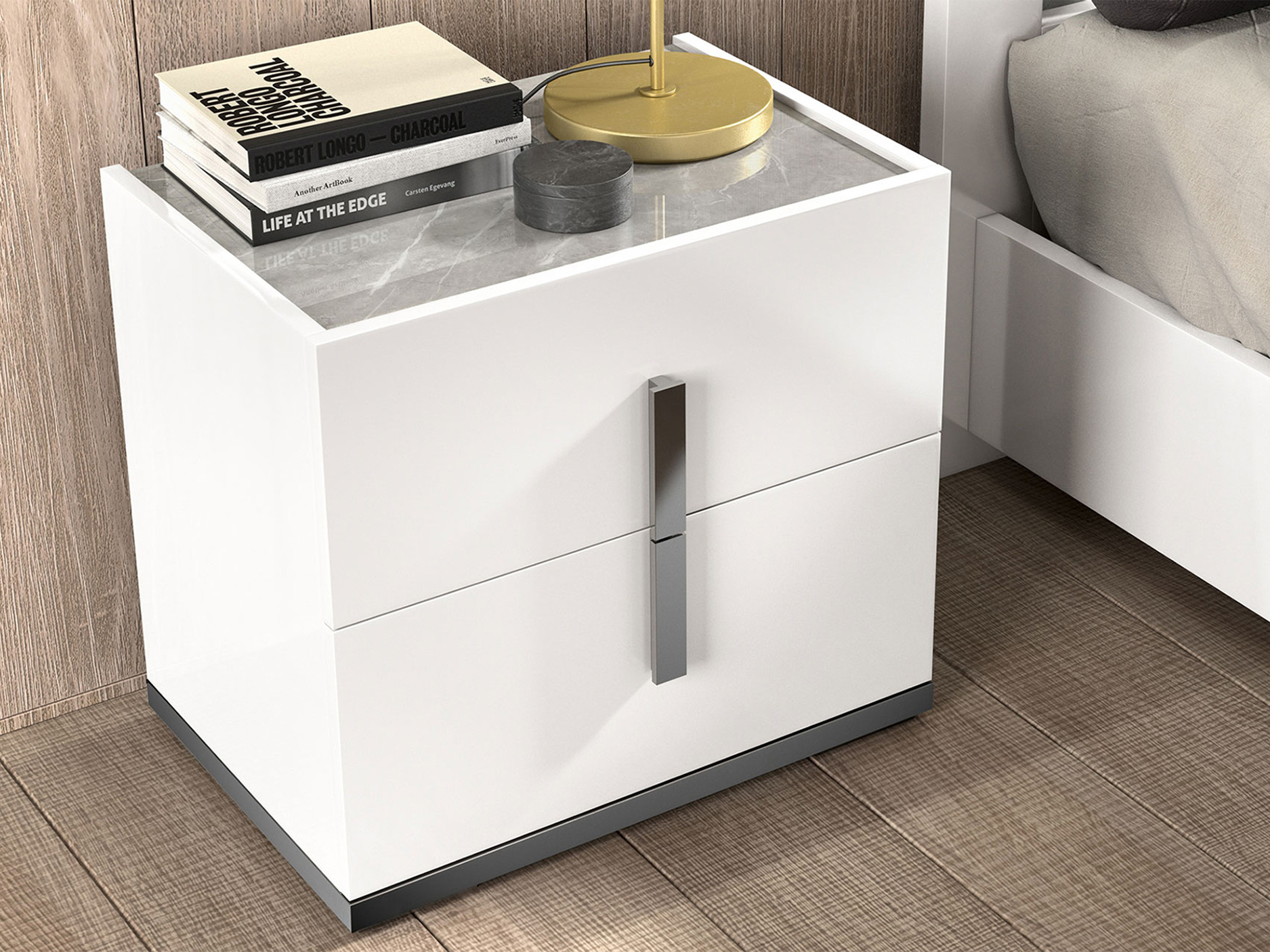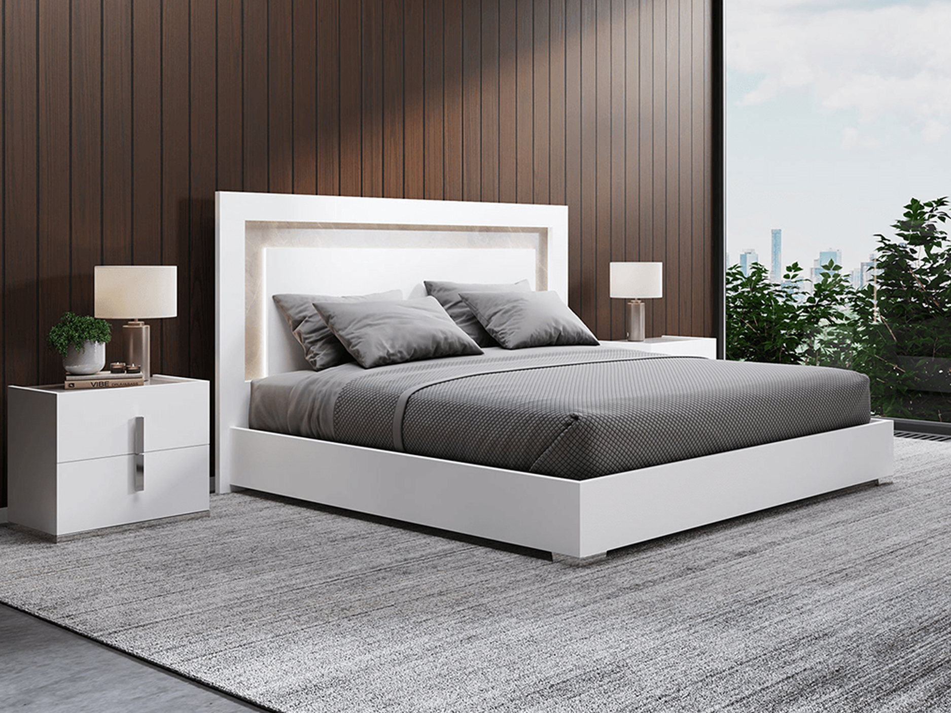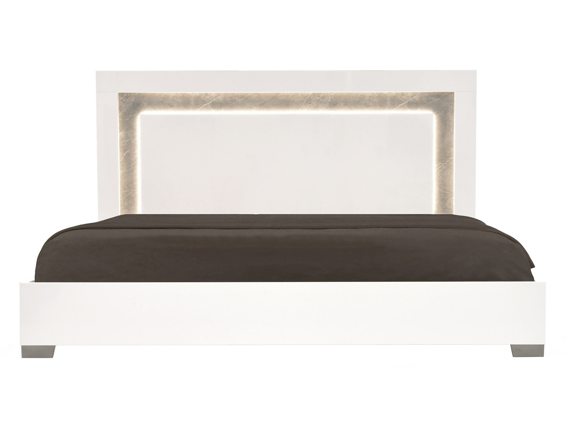 The MELDOLA Bed and Nightstand blend minimalist design with sophisticated accents, creating a chic, modern oasis for your bedroom. The bed’s sleek white glossy lacquer finish, paired with striking black “chromed” accents and faux marble detailing on the headboard, makes a bold yet refined statement. Integrated LED lighting with a discreet touch sensor in the headboard adds an ambient glow, perfect for setting the mood or illuminating your space. The MELDOLA Nightstand complements the bed with its clean lines and stunning materials. Crafted from the same white glossy lacquer, the nightstand features black “chromed” accents on the base and handles, while the faux marble top offers both elegance and durability. The soft-close drawers combine functionality with style, offering a seamless, quiet opening and closing experience. Together, the MELDOLA Bed and Nightstand create a striking, cohesive bedroom look that is both sleek and functional—ideal for those who appreciate clean lines, modern luxury, and subtle details that elevate any space.