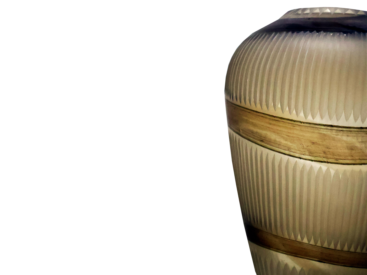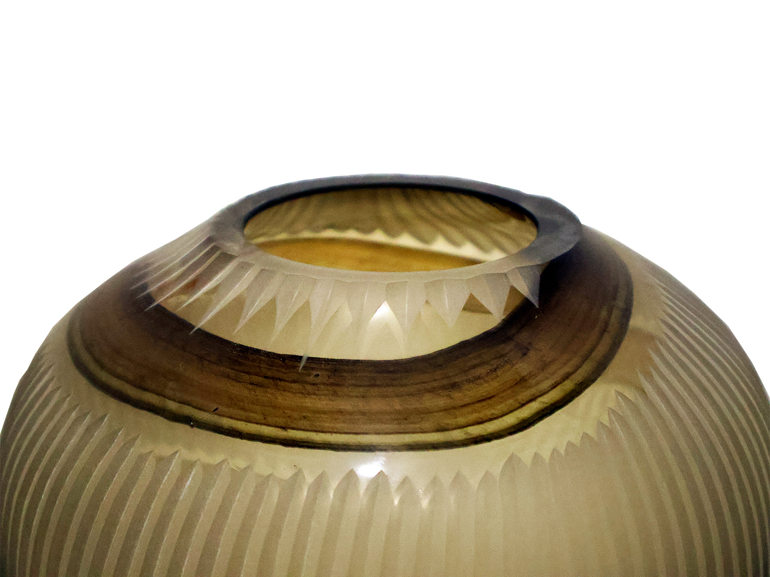 This large Textured Glass vase intriguing curved shape is accented with an overall linear cascade like pattern. Its Smokey colored crystal glass further highlights its statuesque shape. Its detailed with a linear cascade like effect with diamond shaped offsets, creating an intriguing effect throughout its body.