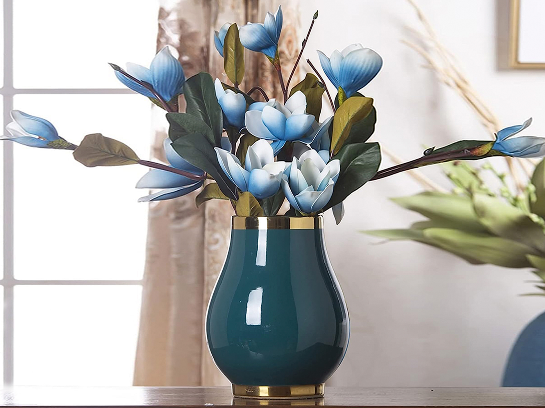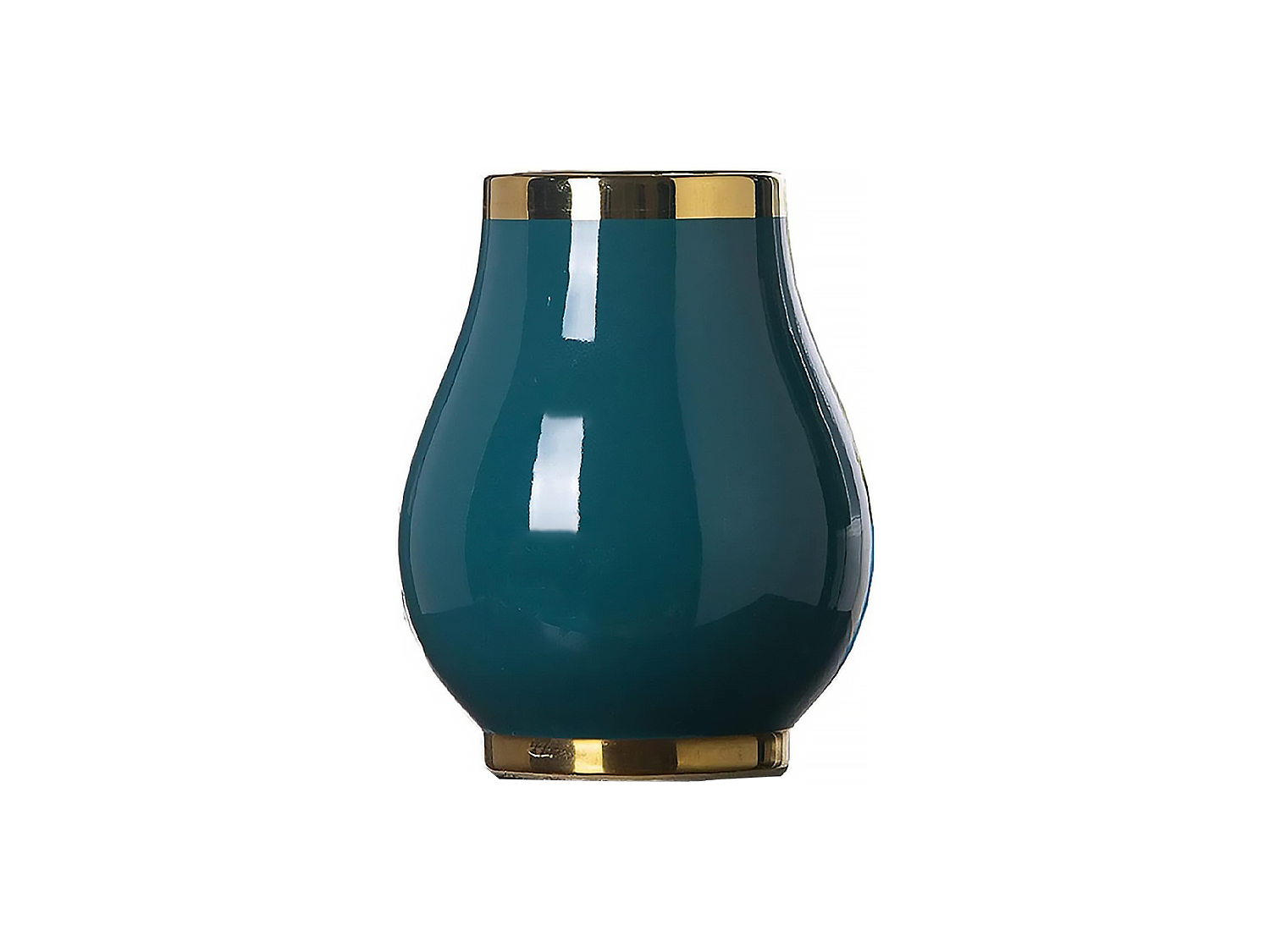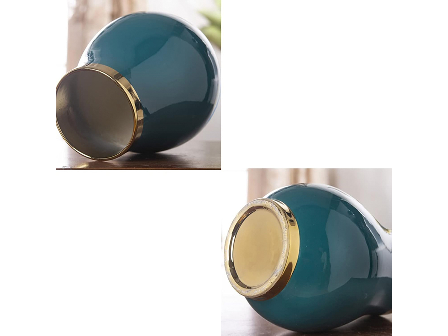 The PROCELINE Vase features a predominantly dark blue color scheme, which is complemented by gold accents at the top and bottom. the vase is made of ceramic with smooth surface, easy to clean and spacious mouth, convenient for flower arrangement. stylish ceramic vase has a beautiful and fashionable appearance, giving your flowers a beautiful display.