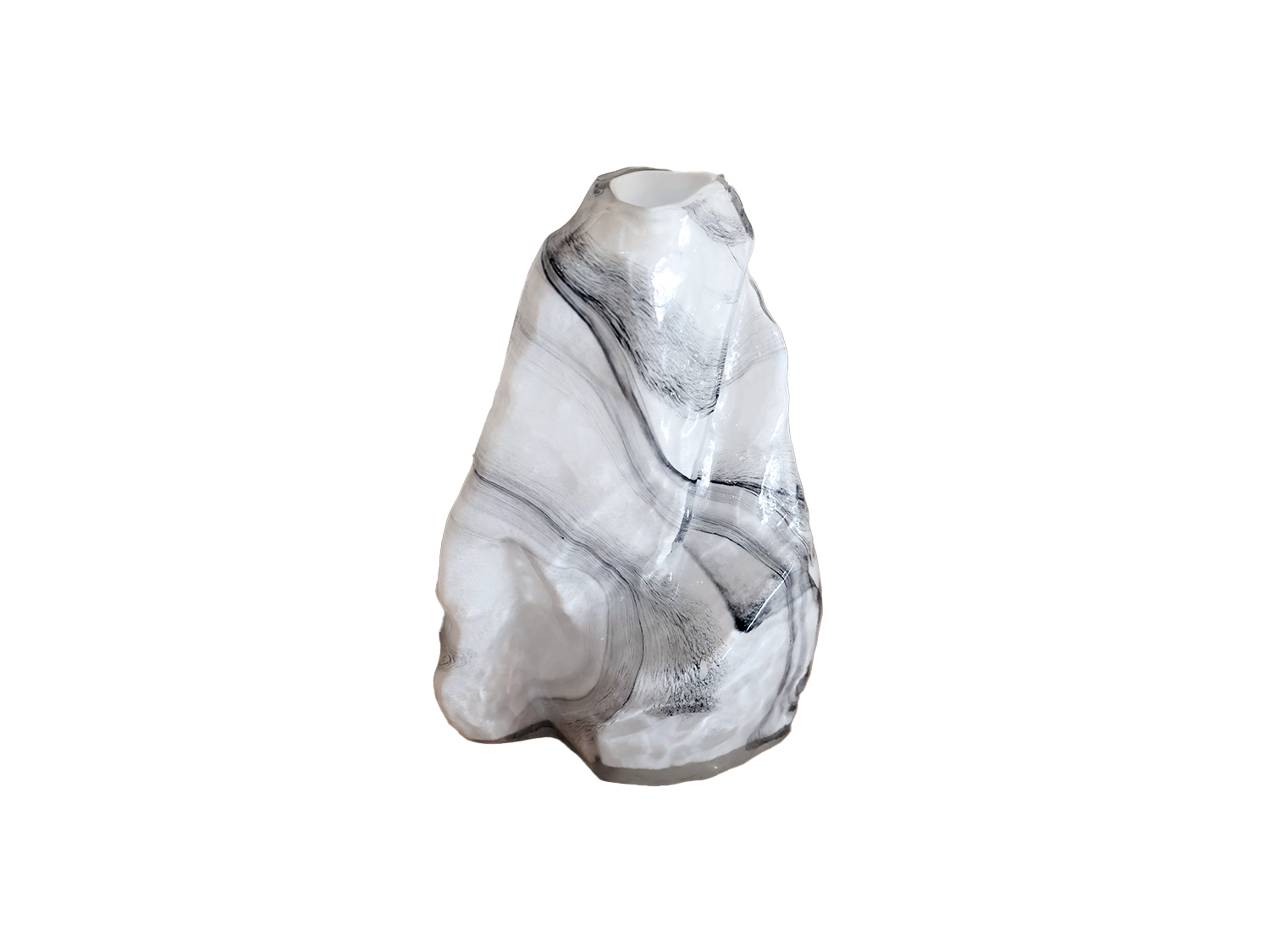 It White Blown Glass Vase, 9 inches tall and has a unique, asymmetrical shape & its high-quality white marble. Vases, like this one, have a rich history and cultural significance, serving as symbols of tradition and artistic expression. They are used for both fresh and artificial flower arrangements.